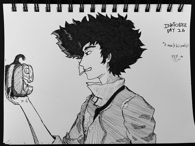 A man and his pumpkin #inktober2021 . #anime #animeart #90sanime #CowboyBebop #spike #spikespiegel #bountyhunter #pumpkin #halloween #ink #inktoberday26 #streamer #stream