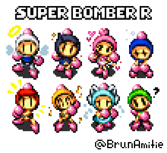 Because most people enjoyed that last #SA3-styled row of Team Bomber Combination #sprites I've made the last time I did #spriteart...I decided to also get my hand on doing SA overworld-styled sprites for the eight #Bomberman Brothers as well! So... #ボンバーマン #イラスト