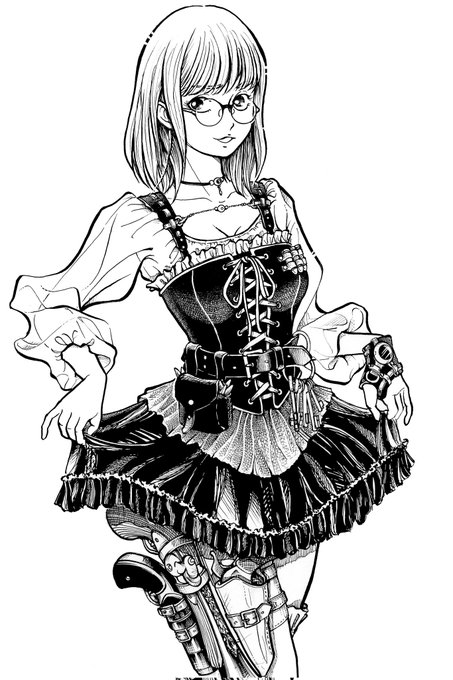 弾丸メガネっ娘のスチームパンクちゃん。 #steampunk_girl #illustration #スチームパンク #アナログイラスト #steampunk #モノクロイラスト #イラスト #illust #ペン画 #オリキャラ #絵描きさんとつながりたい # lolitapunk #lolita