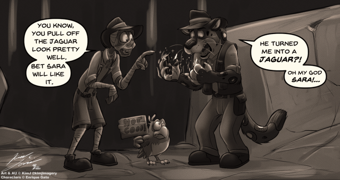 To avoid attracting attention Tad, Mummy Sarah and Ramona quickly drag Freddy into a back alley before anyone else sees Tad's Jaguar form. ☕ Support me on Kofi for more amazing art #Tadeojones #jaguarAU #fanart #storytelling #TFTuesday