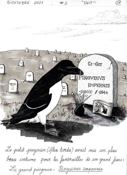#bioctobre2021 #inktober2021 : j2 #suit L'occasion de commémorer le grand pingouin dont l'#extinction récente (1844) est bien sûr liée à l'humain. Il ne reste donc plus qu'une espèce de pingouin: Alca torda, dont le costume de deuil est toujours impeccable. #sciart #svt #birds