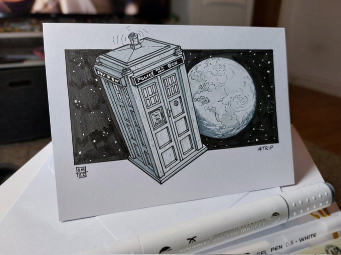 Day 7 of #Inktober2022 The word prompt today (technically yesterday but whatever 😊) was #Trip. The Tardis and the Doctors favourite place to take a trip too...Earth! #DoctorWho #Tardis #Inktober #InkArt #InkDoodle