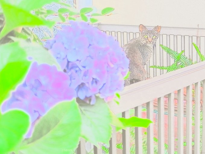 #過去写真 こちらは昨年の #猫と紫陽花。 #通勤スナップ のお供 #Canon #PowershotG5 #クリエイティブショット で #イラスト 風の仕上がりに。 #僕らの居場所は言わにゃいで #桜耳 #桜猫 #ねこGO #紫陽花の季節 #TLを紫陽花でいっぱいにしよう #TLを花でいっぱいにしょう