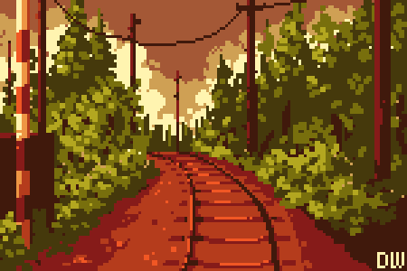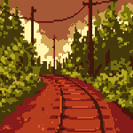 Doubling up #pixel_dailies @Pixel_Dailies themes! AND keeping a colour palette limit by @runmry 💚 Thank you again! Its #unknown to me where the #train is? - must be running late as per. 🚃 #pixel #pixelart #ドット絵 #aseprite #landscape #traintracks #sunset #evening #forest