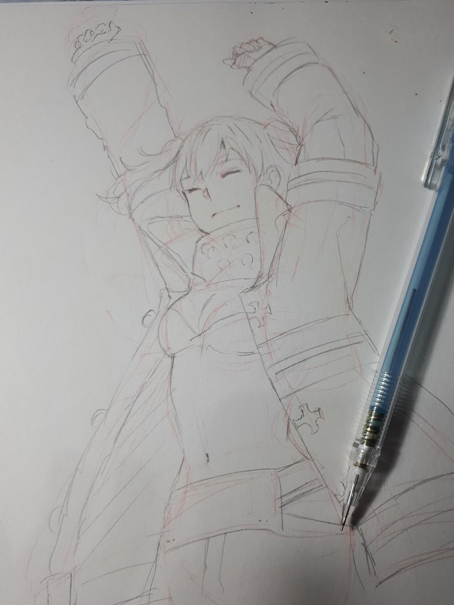 line art for tamaki kotatsu from fire force! honne_69’s stories compelled me to try out lining with pencil instead of ink #wip #fireforce #tamakikotatsu #rkgk #sketch