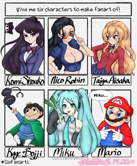 Thank you for your suggestions, #SixFanarts is finally done! #SixFanartsChallenge #ONEPIECE #toradora #KomiShouko #OusamaRanking #Miku #Mario