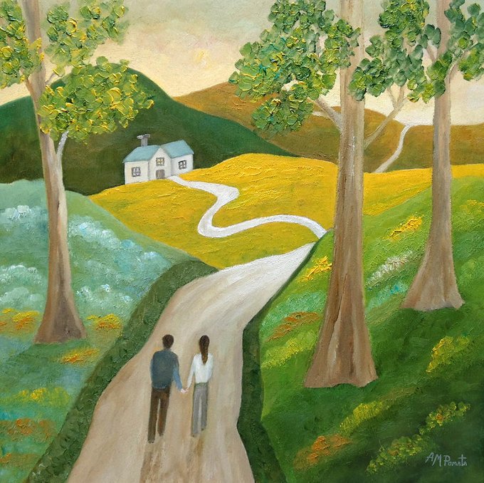 This is my painting "Bringing You Home" (please click on it to see it in full). You can check it out here: fineartamerica.com/featured/bring… #art #arte #repost #artprints #kunst #oilpainting #contemporaryart #ArtistOnTwitter #green #tree #couple #landscape #hills #stripes #house #family
