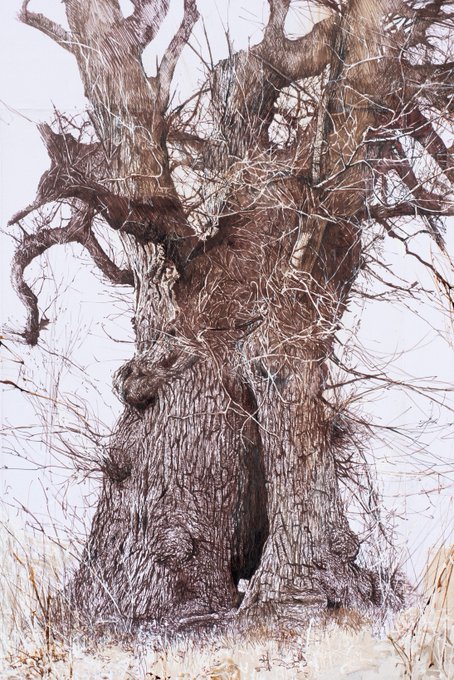 Work in progress on my drawing of the oldest surviving elm tree in the world. Sepia ink and white body colour on paper. #elm #drawing #ClimateCrisis #tree #britishandscape