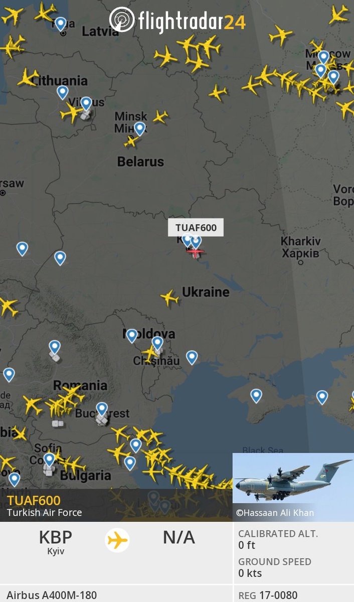 Curious thing. After publishing here on Twitter a printscreen of flightradar24.com showing a military aircraft from #Turkey landed in an airport in #Ukraine, the plane is no longer visible on the map. 🤔