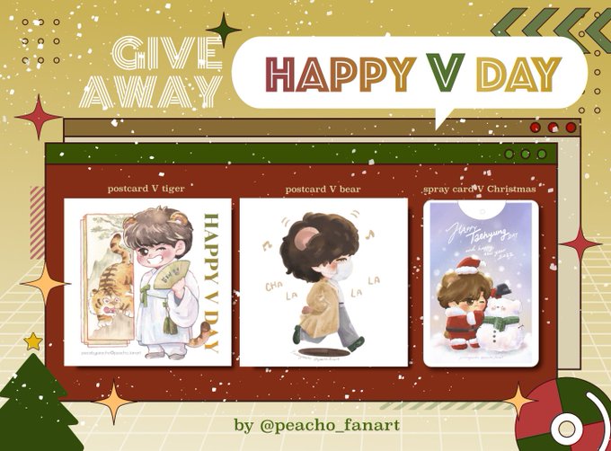 pls rt🎄 🐻 GIVEAWAY hbd V day🐯 by peacho_fanart (สุ่มแจก 27/12 จากโพสนี้ 2set ) 💌postcard 2 ea 💜spray card 1 ea — form : 27.12.2021 — time : 20.00 p.m — shipping : 30 ฿ — 15 set #VDAY #taehyungday #btsfanart #BTS