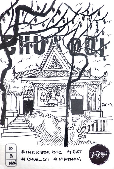 ベトナムで(bat=コウモリ)と言われて思い出したのがSóc Trăngにあるコウモリ寺のChùa Dơiでした。 #inktober2022 #inktober #bat #vietnam #bat_temple