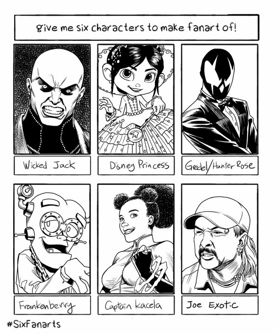 Final Batch 4/4. phew! That's all folks! #sixfanarts #wickedjack #disneyprincess #vanellope #gredelhunterrose #frankenberry #captainkacela #joeexotic #tigerking #blackandwhite #medibangpaint