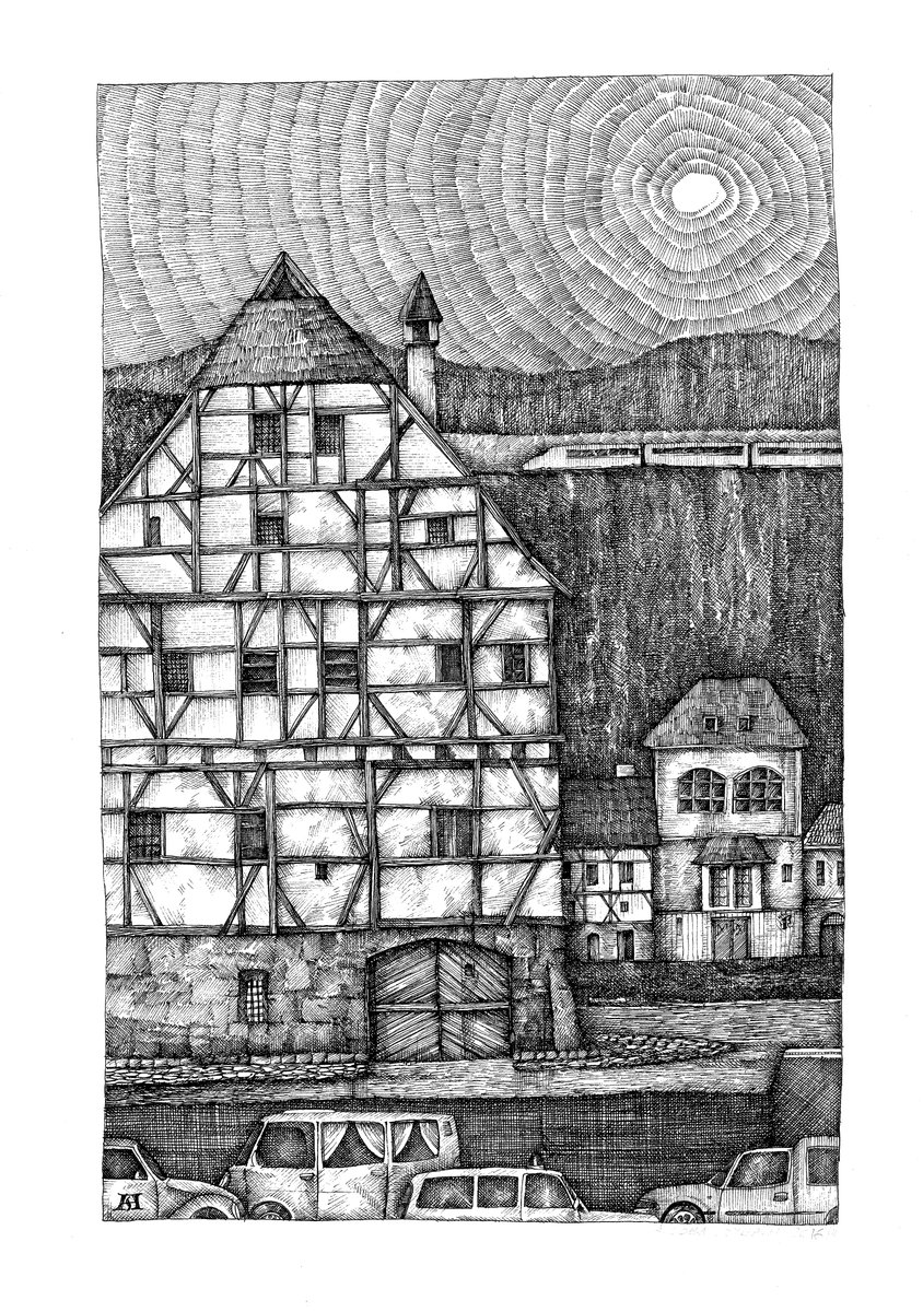 Seemingly nothing is happening. Portrait of a small town. Apparemment, rien ne se passe. Portrait d'une petite ville. #artwork #drawing #smalltown #dessin #inkdrawing #illustration #village #albs #Geislingen #Germany #ArtistOnTwitter