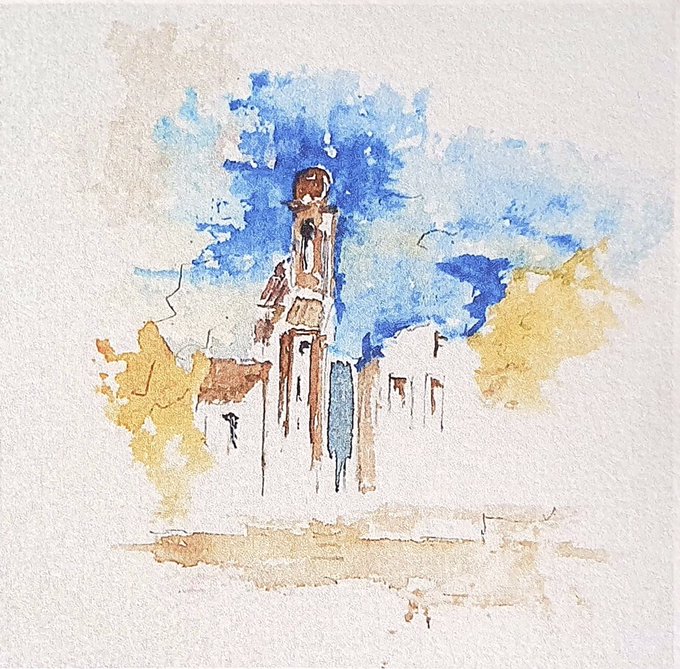 This is my new painting "First Spring In Cariatiz". The original is for sale (please DM me if interested!) and you can also find very nice prints of it here: fineartamerica.com/featured/first… #art #painting #artprints #flower #trees #almond #village #pomata #town #house #countryside