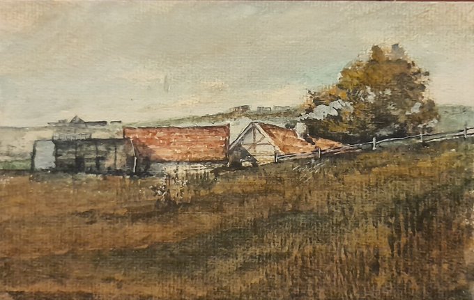 This is my painting “A walk along the creek” #landscape #sky #clouds #windmill #creek #footpath #village #bench #oilpainting #art #artistsontwitter