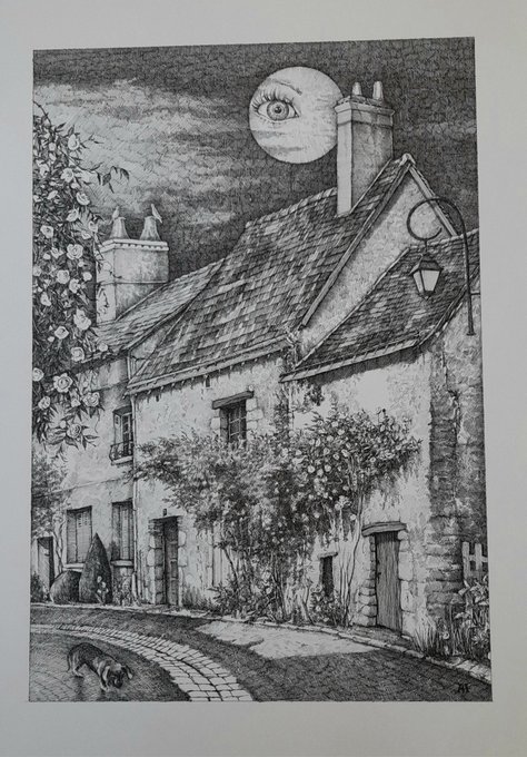 I am waiting. J'attends. #drawing #dessin #illustration #wait #inkdrawing #art #artist #home #village #fullmoonnight #artgallery