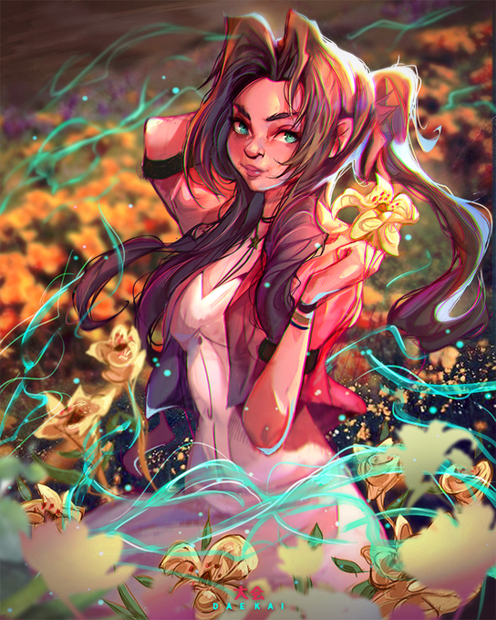 My girlfriend is now playing the classic FF, starting from VII, so I propose myself I would make a fanart of every FF once she finishes it! Recently she ended 7 so here's a tribute to our Aerith :) #FinalFantasyVII #Aerith #fanart #digitalart #wacom #illustration #FFVII