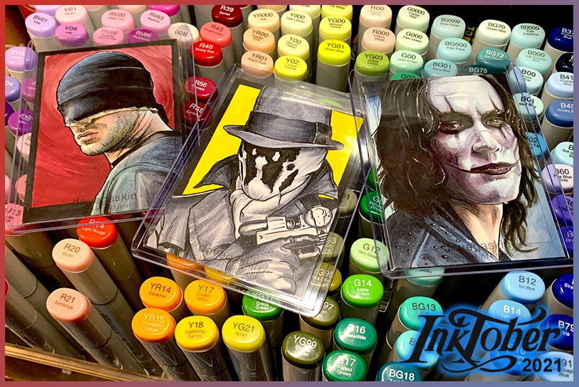 ✏️ Now that Daredevil is finally complete, this trio of night-time vigilantes are heading off to their new home together! 🌜 #Daredevil #Watchmen #TheCrow #Inktober2021
