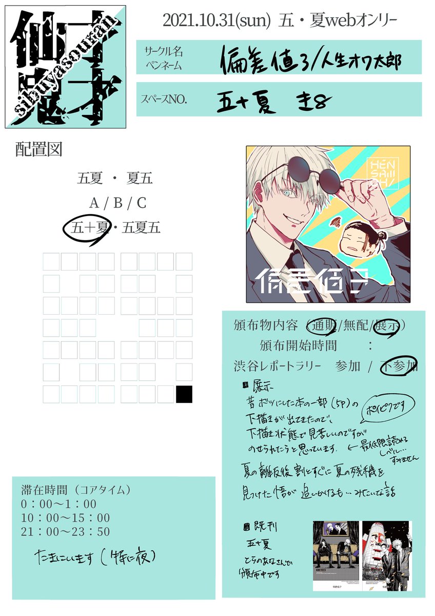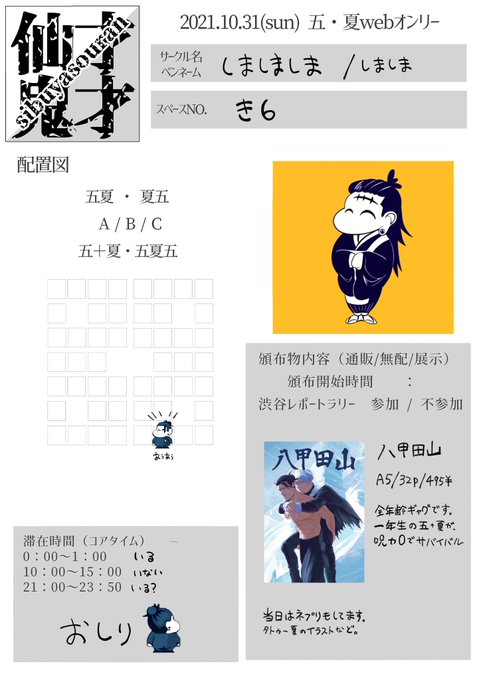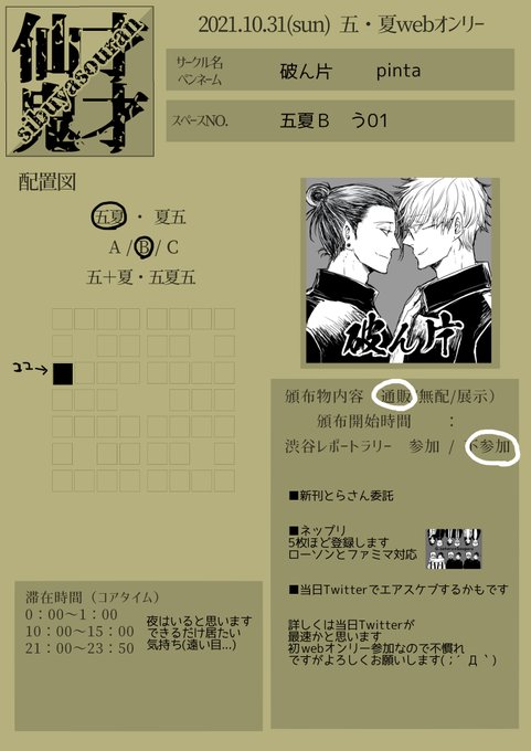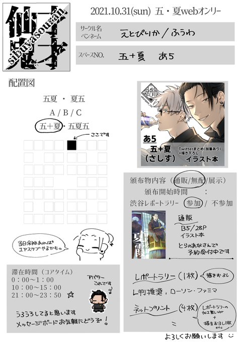 #WEBオンリー仙才鬼才 開催おめでとうございます! 修正したので上げ直し失礼します🙇♂️ 【五+夏 あ5】 でスペース頂きました イラスト本頒布+ネップリ(レポートラリーも参加します)の予定です🐣 当日余裕があればエアスケブやるかもしれない… よろしくお願いします┏○