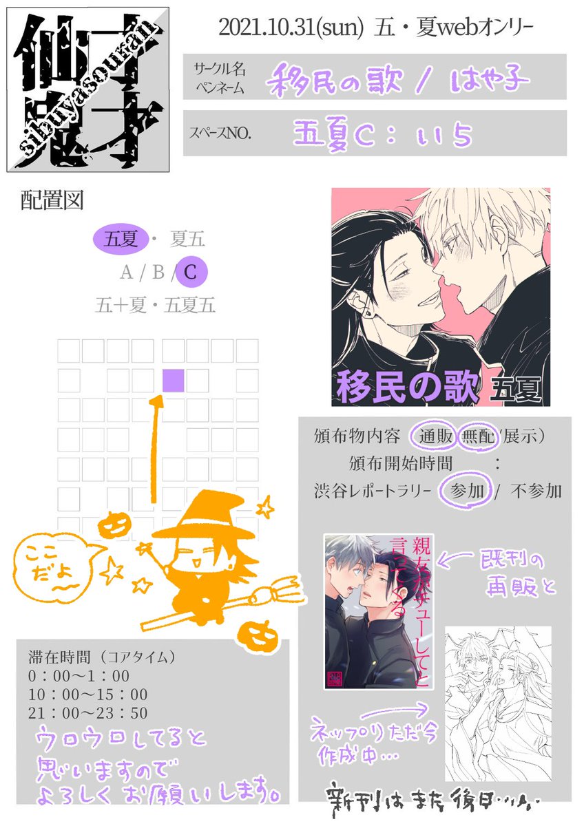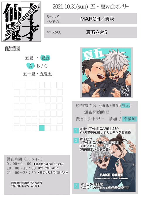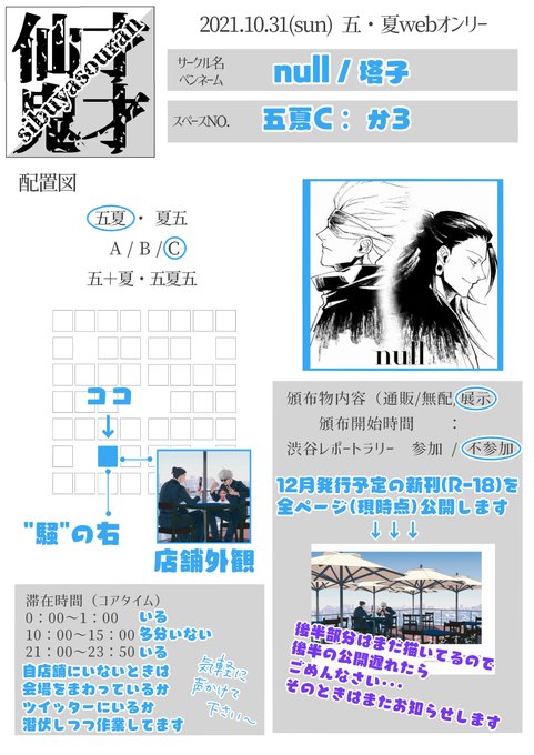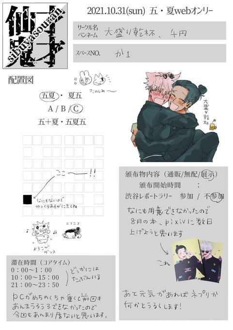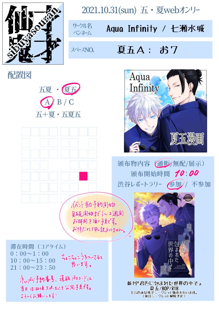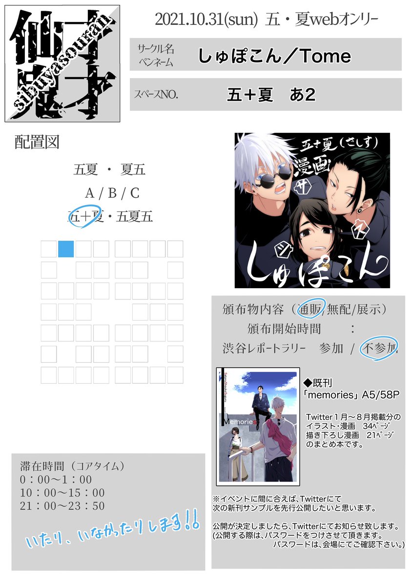 #WEBオンリー仙才鬼才 開催おめでとうございます! 五+夏「あ2」にてスペースを頂いております。 既刊「memories」の販売と 間に合いましたら、Twitterにて次の新刊サンプルを先行で公開する予定です。(パスワードは、会場にてご確認下さい。)