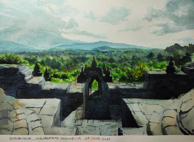 インドネシアにある世界遺産ボロブドゥール遺跡からの遠望を水彩スケッチで。(さらに加筆しました) Panoramic view from the Borobudur, Indonesia. #watercolor #sketch #水彩 #スケッチ #世界遺産 #Indonesia #WorldHeritage #drawing #painting