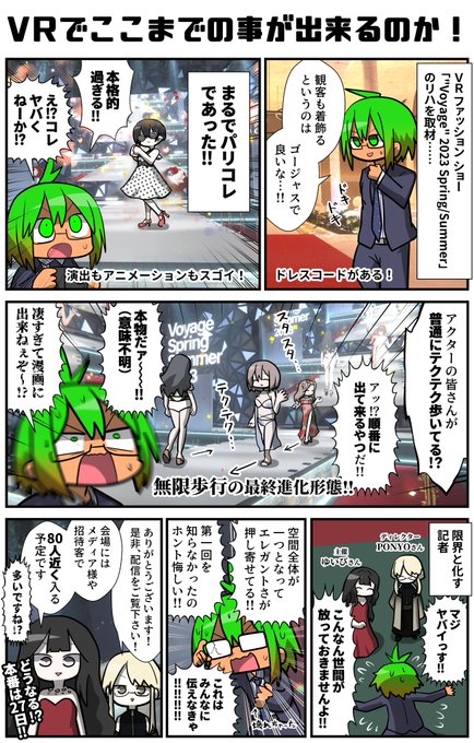 VRってこんな事出来るのか!?という衝撃的なファッションショー「"Voyage" 2023 Spring/Summer」のリハを取材したリーチャは喋りまくっちゃってダメになってしまう!伝えねば…!この衝撃! 本番配信はこちら!27日を待て!→twitch.tv/voyage_vrc #VRC漫画 #VRChat #ad #VFC_Voyage #Voyage2023SS