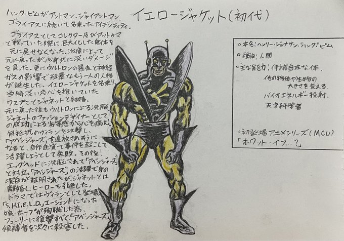 手描きMCUヒーロー列伝イエロージャケット ・本名:ヘンリー・ジョナサン・ピム ・種族:人間 ・能力:伸縮自在な身体、バイオエネルギー投射、天才科学者 ・初登場アニメ作品(MCU) 『ホワット・イフ…?』 #marvel #芸術同盟 #絵描きさんと繋がりたい #みんなで楽しむTwitter展覧会 #AntMan #Wasp