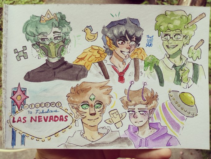 Watercolor stuff?? Idk Las Nevadas squad :3 (haven't drawn on paper in a while) [#quackity #quackityfanart #awesamdude #awesamdudefanart #slimeciclefanart #purpledfanart #foolishfanart]