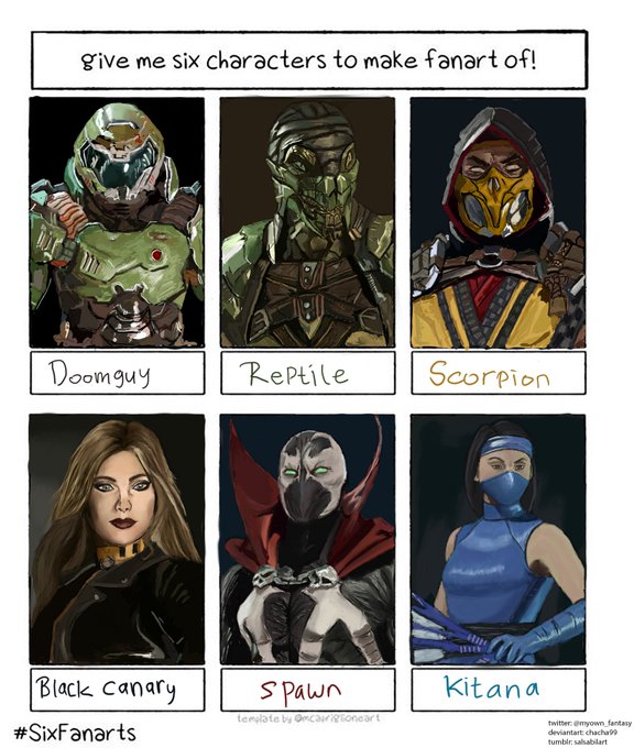 It's done! Here's my entry for #SixFanarts finally got something to do during this quarantine. #DoomEternal #DOOM #Doomguy #Reptile #Scorpion #BlackCanary #Spawn #Kitana #Bethesda #Netherrealmstudio #NRS #MortalKombat #WBGames #SixFanartsChallenge