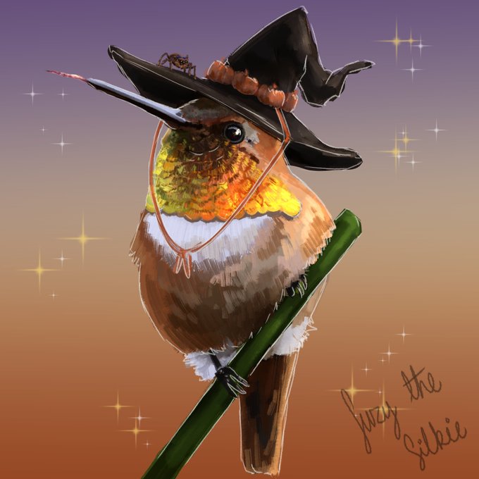 Strolling into #birdtober2022 day 4: the hummingbird #Drawtober2022 Pumpkin Witch has an addiction to seasonal beverages....