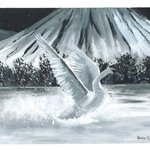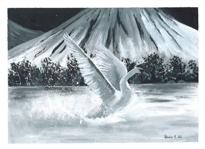Hello everyone! 🙂 I'm so happy with how this painting turned out! ✨💕 This is the first time that I paint with black and white only. I had started it in mid-June but I was stuck on it, maybe I was afraid of ruining it! 🦢🌊🏔️🌸 #birdtober2022 #Inktober #birdtober day 5: Swan