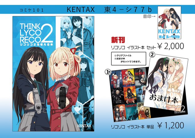 30日(金)1日目 東4-シ77b 「KENTAX」のお品書きです おまけ付きセットも少量ですが用意しました 映画パロネタでいっぱいページ埋めたのでよろしくお願いします! メロン予約こちら→melonbooks.co.jp/detail/detail.… pixiv.net/artworks/10387… #C101 #C101お品書き #C101新刊 #リコリコ