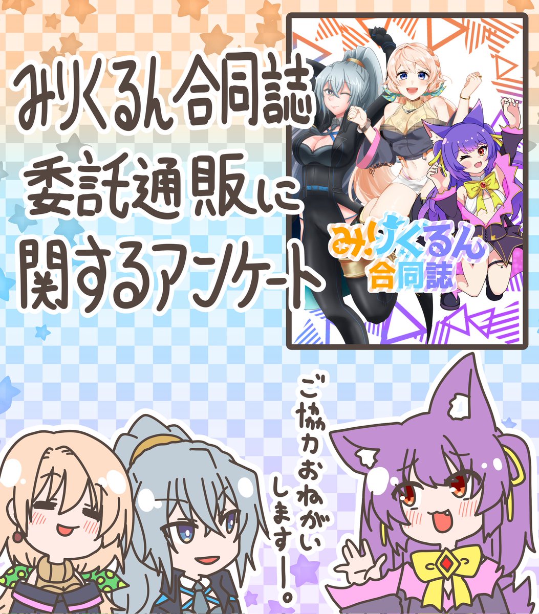 #C102 コミケで販売したみりくるん合同誌ですが、買えなかった方々にも手が届きますよう、この度委託通販をすることになりました! その為、欲しい方を募りたくアンケートを致します! ですので、こちらのフォームのアンケートにお答えくださいー(^q^) ↓ docs.google.com/forms/d/e/1FAI…