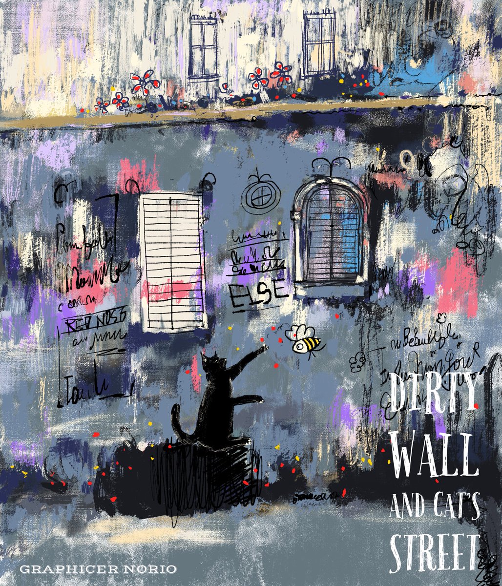 古い壁と綺麗な瞬間 ひさびさのカラー 汚れた壁と猫の遊び 汚れていても美しい空間 #illustration #drawing #picturebook #blackcat #catlovers