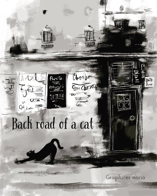 猫の裏道 モノクローム 古壁と猫 のびする猫 #illustration #drawing #picturebook #graphicart #GraphicDesigner #artdirector #CatsOnTwitter #catlover