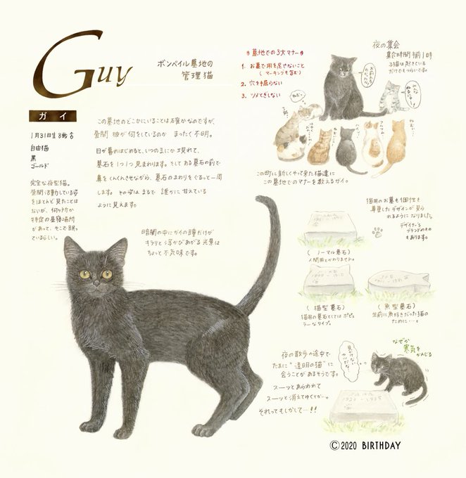 ネコ町ナーゴの猫だより 自由猫のガイは、面倒をよく見てくれていた おじいちゃんが亡くなった頃から、この墓地に毎日通うようになり 墓地の番人のようになりました。#ネコ #猫 #猫イラスト #猫あるある #cat #catstagram #cats #catsagram #catillustration