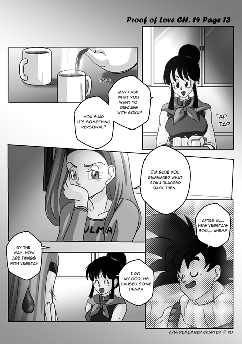 Sry for the silence my job is too stressful atm but here have some #proofoflove update! Chapter 14 Pages 13-15 #pol #doujinshi #vegebul #chichi #bulma also some Son's make an appearance xD twitter.com/lovelykotorii/…
