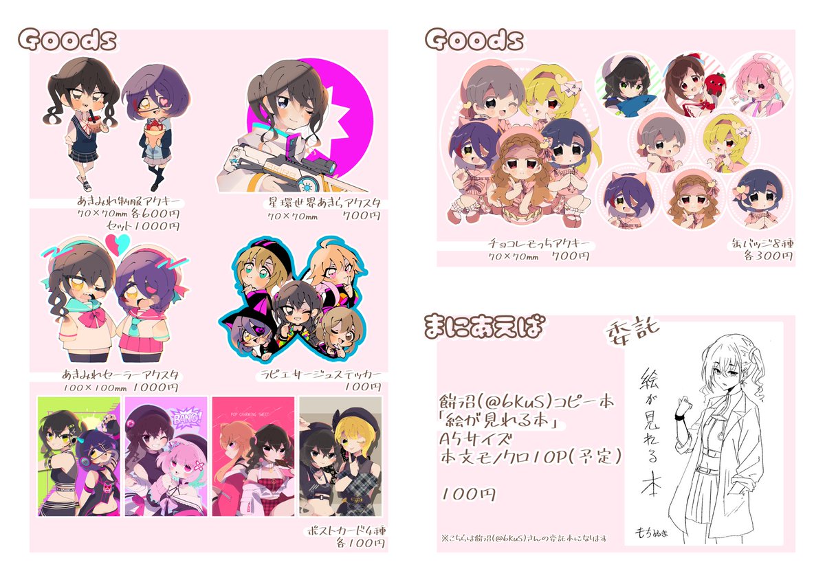 3/12開催 #シンステ11 のお品書きです あきみれ中心にグッズたくさん持っていきます🦈😈間に合えば色紙も出る予定です❕ ゐるを(@tokotoko_aspara)ちゃんとの合同サークルで、餅沼(@6KuS)さんのコピー本も委託予定です サークル【くるみゐろ】 スペース【つ-47・48】でお待ちしております #cin_stage