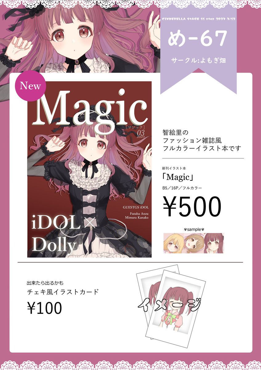 シンステのお品書きです🎀 【め-67】 前回に引き続き智絵里の雑誌風イラスト本です!表紙含め7ページの描き下ろし+ツイッターに載せたイラストの全16ページです! 私が頑張ればチェキ風のカードも出ます📷 当日はよろしくお願いします〜! #cin_stage #シンステ