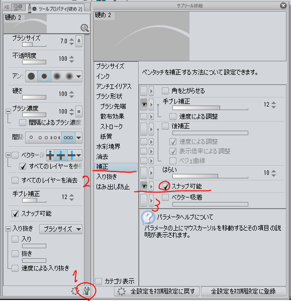 クリスタ、対称定規で「消しゴムが対象にならない」という人は、ツールの設定を見て下さい。 「スナップ可能」を有効にする必要があります。 この設定はすべてのブラシにあります。 #clip_studio #clip_celsys