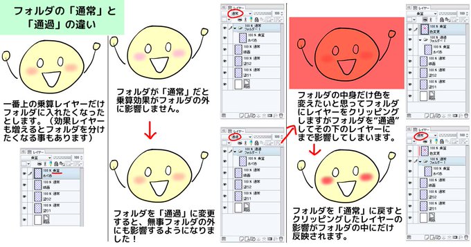 フォルダ(通過)に効果レイヤーをクリッピングしたら全体に効果がかかってビビッたので、クリスタのフォルダの「通常」と「通過」の違いをまとめてみました。 「ファイル→環境設定」で「通過」をデフォにするか選べます #CLIP_STUDIO