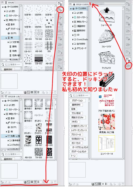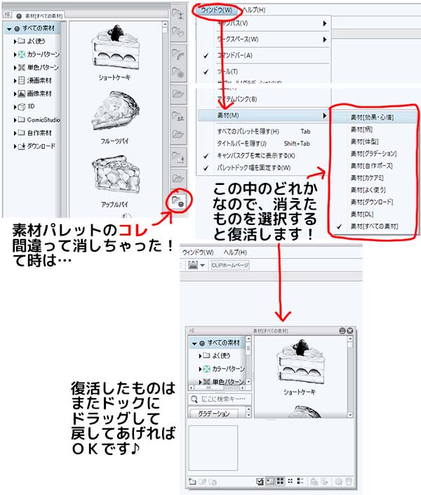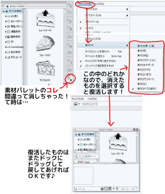 ウッカリ素材パレットを消しちゃって元に戻せない!?て方はいませんかー? 私は戻し方わかるまで結構かかったので… あと素材パレットっていろいろカスタマイズ出来るみたいですよ! #CLIP_Celsys #CLIP_STUDIO