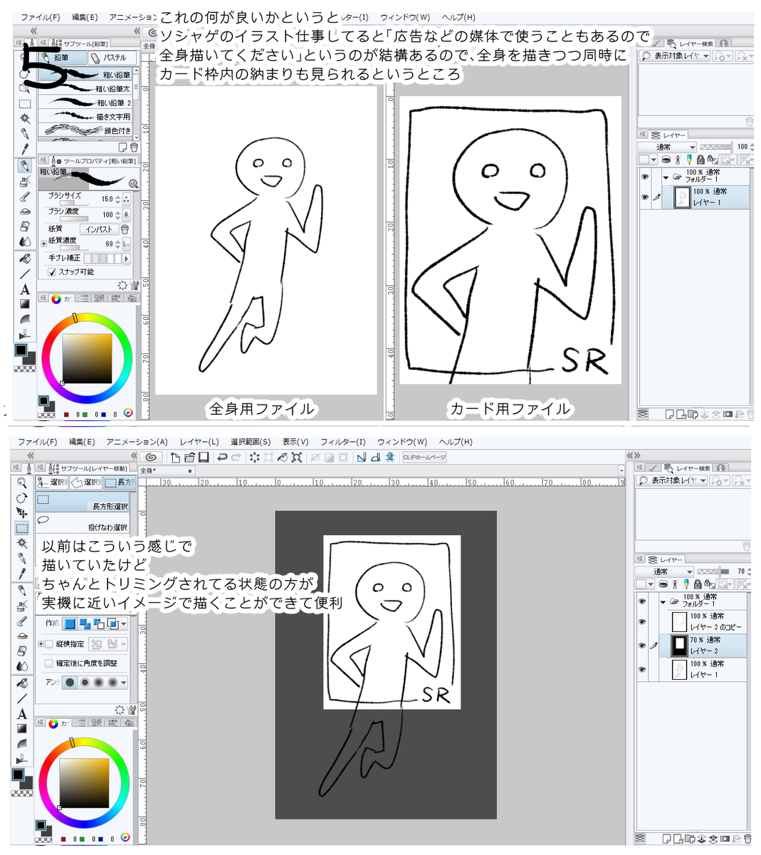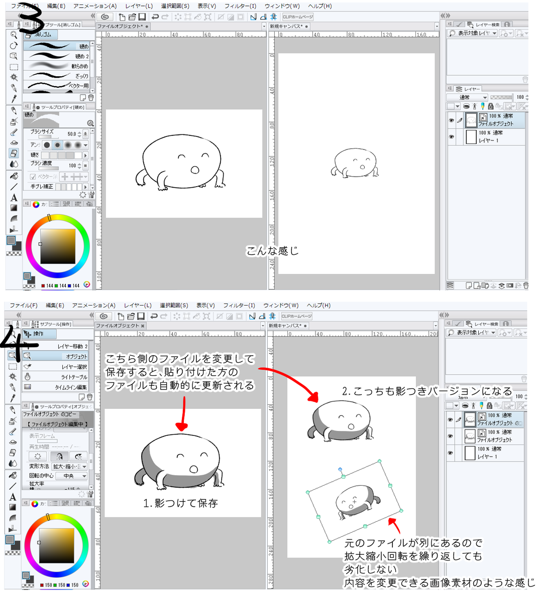 クリスタでPhotoshopでいうところのスマートオブジェクトみたいなのないかなーと思ってたら例のごとく私が知らなかっただけで普通にあったのでこの機能を発見してからの仕事ではたいへんお世話になってます。 #CLIP_STUDIO