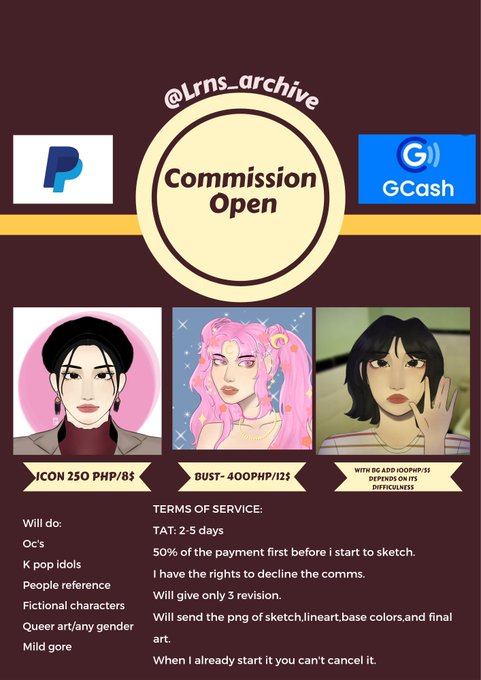 Slots and waitlist open! Finally sticking to this commission sheet as well. For inquiries, just dm or email me💌 ➤Queue: trello.com/b/l9yYWLM8/com… ➤Tip jar: ko-fi.com/E1E35GWJA #commissionsopen #arttwt #commstwt #artph #artcommissions