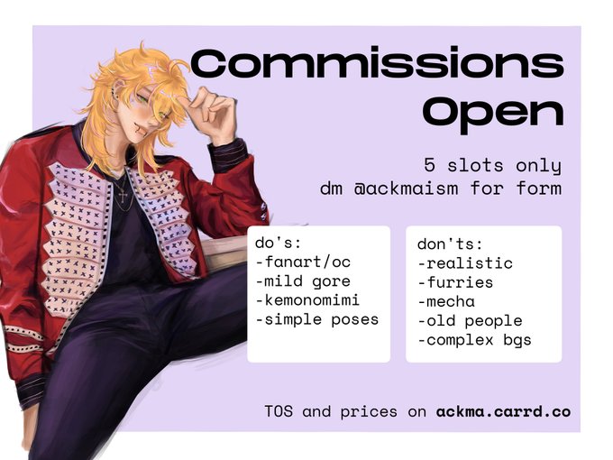 ✨COMMISSIONS OPEN✨ i'm opening 5 slots of commissions more information on ackma.carrd.co dm me if you're interested !! [all likes and retweets appreciated] #commissionopen #commissionart #artcommissions #opencommissions #ArtistOnTwitter #commstwt