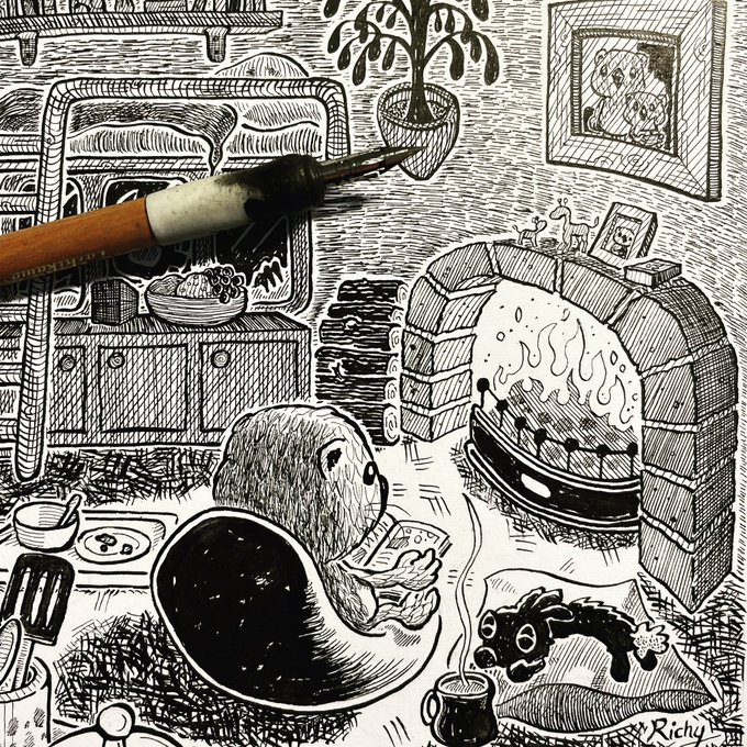 It’s going to be quite a while before this tale is complete, but think it’s important people know I’m working on something featuring this otter. #otter #creature #fireplace #cosy #hygge #reading #illustration #drawing #ink #dippen #dippenandink #blackandwhite