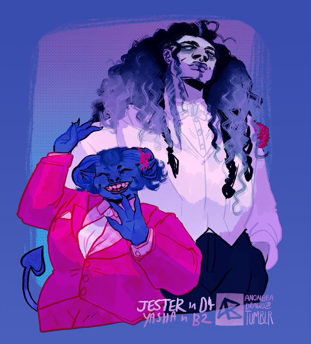 for a suit challenge on tumblr i.e Yasha takes jester to her Prom AU to prove that Jester is so OVER some douchebag. Jester bought her the matching flower for sure 🌺🍭 #criticalrolefanart #CriticalRole #CRC2 #yashanyoodorin #yasha #JesterLavorre #anonbeadraws #digitalart