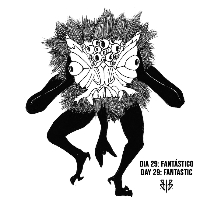 Dia 29 porra "O leão mascarado dança e pula, o som de guizos invisíveis estourando a cada passo pesado. Não confunda sua dança alegre com perigo inexistente, entretanto." #conceptart #darkarts #inktober2021