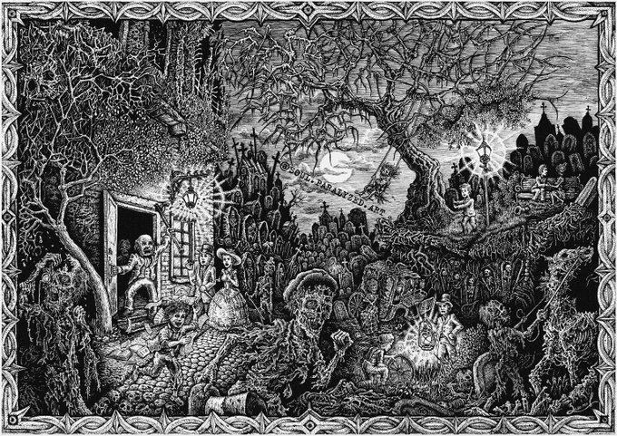 "Life's Light, Death's Dark" Ink on paper, 16.5" × 11.7", 2020 Available as prints in my Etsy shop. This is some piece commissioned almost two years ago. The initial idea was to depict people being alive in the light and being ghoulish in the dark. #darkarts #inkdrawing