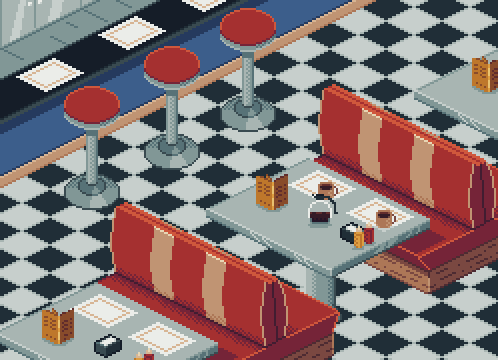 Blanco and Louie are supposed to be investigating a diner that got robbed earlier. However, Blanco gets a little distracted... #digitalart #illustration #diner #cat #police #detective